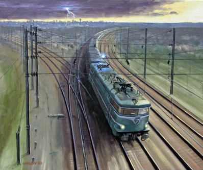 As an electric storm blows away on the horizon, an SNCF 16000-class ‘BB’ locomotive also creates sparks from its pantograph, negotiating a web of 25,000-volt catenary. The time is the late 1950′s, and the place is a junction on the Nord region. These locomotives, initially used for Paris-Lille expresses, were still in use at the time of writing (2006).